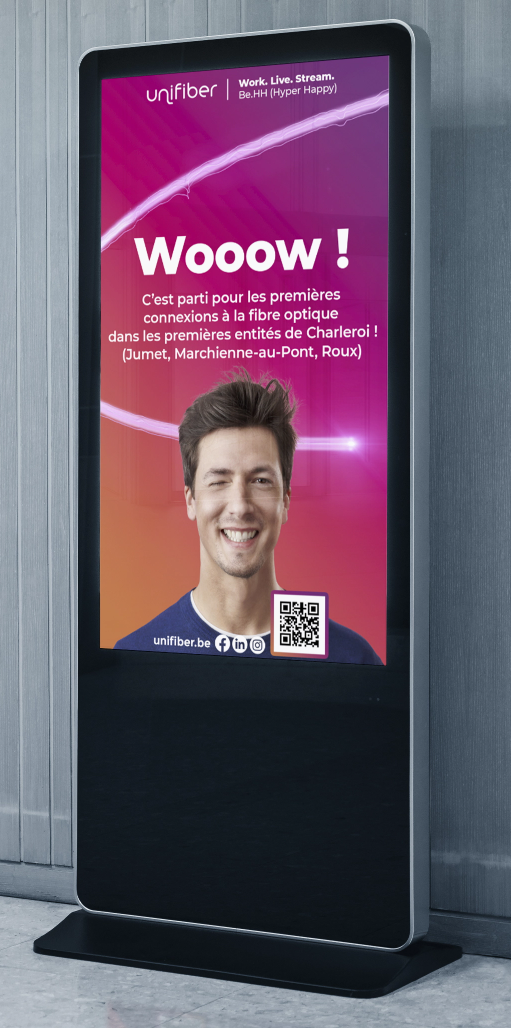 Une technologie qui, malgré son importance, demeure floue pour bon nombre d’utilisateurs. Pour répondre à cette problématique, une campagne didactique a été imaginée, visant à rassurer les Wallons sur l’importance de la fibre. Pour rendre le message accessible et engageant, deux ambassadeurs ont été créés : UNI et FIBER. Leur rôle : vulgariser un univers technologique souvent perçu comme complexe et instaurer une relation de confiance. Leur dynamique permet de simplifier l’information technique et d’humaniser la marque au travers du discours.